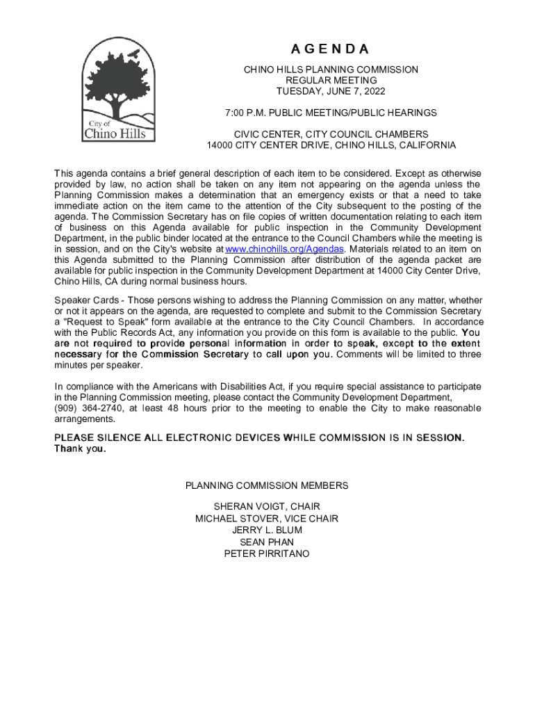 AGENDA CHINO HILLS PLANNING COMMISSION REGULAR MEETING TUESDAY, JUNE 7, 2022 7:00 P.M. PUBLIC MEETING/PUBLIC HEARINGS CIVIC CENTER, CITY COUNCIL CHAMBERS 14000 CITY CENTER DRIVE, CHINO HILLS, CALIFORNIA