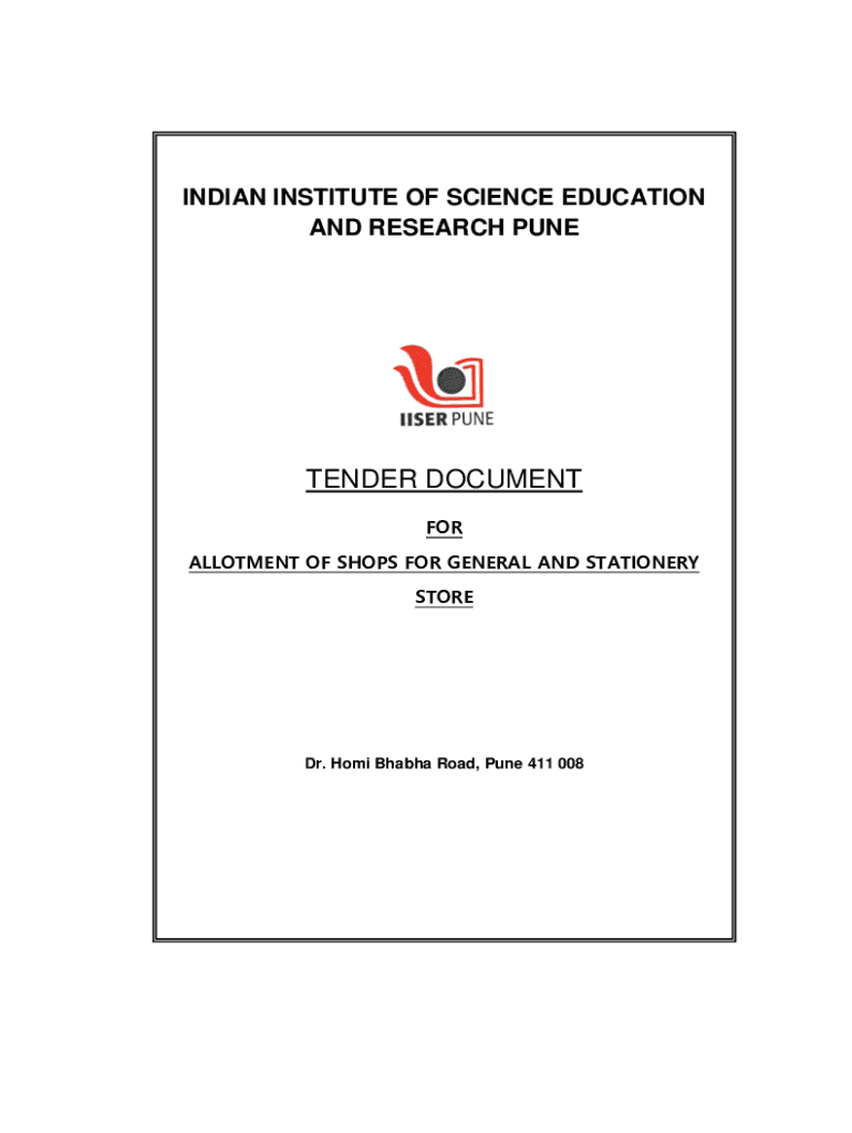 INDIAN INSTITUTE OF SCIENCE EDUCATION AND RESEARCH PRETENDER DOCUMENT FOR ALLOTMENT OF SHOPS FOR GENERAL AND STATIONERY Stored. Home Baha Road, Pune 411 008INDEXSr. No. Particulars Page No.1Tender