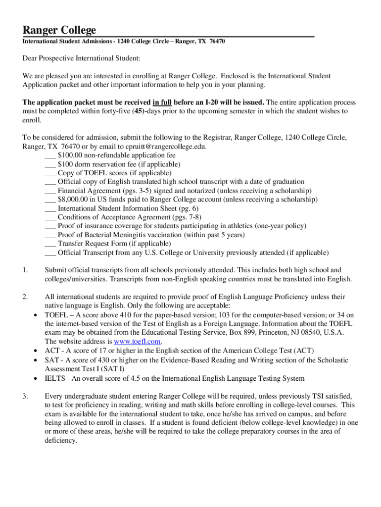 Ranger College International Student Admissions 1240 College Circle Ranger, TX 76470Dear Prospective International Student: We are pleased you are interested in enrolling at Ranger College. Enclosed