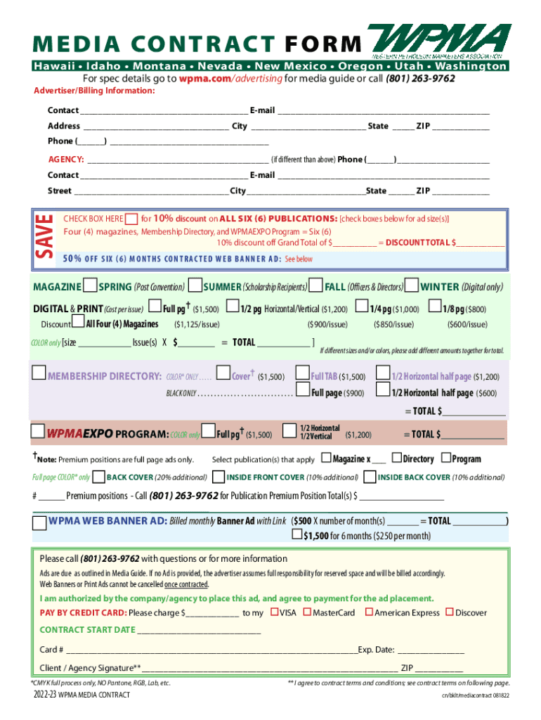 M E D I A CO N T R AC T F O R M Hawaii Idaho Montana Nevada New Mexico Oregon Utah Washington For spec details go to wpma.com/advertising for media guide or call (801) 2639762Advertiser/Billing Information:Contact
