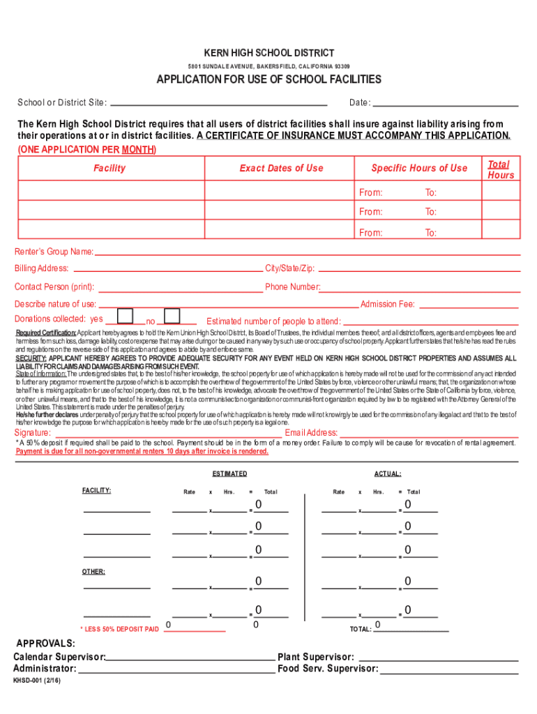 KERN HIGH SCHOOL DISTRICT 5801 SUNDAE AVENUE, BAKERSFIELD, CALIFORNIA 93309APPLICATION FOR USE OF SCHOOL FACILITIES School or District Site:Date:The Kern High School District requires that all users
