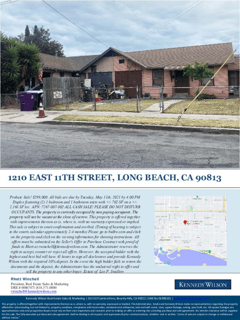 1210 EAST 11TH STREET, LONG BEACH, CA 90813 Probate Sale! $299,000. All bids are due by Tuesday, May 11th, 2021 by 4:00 PM Duplex featuring (2) 1 bedroom and 1 bathroom units with +/ 702 SF on a +/2,168