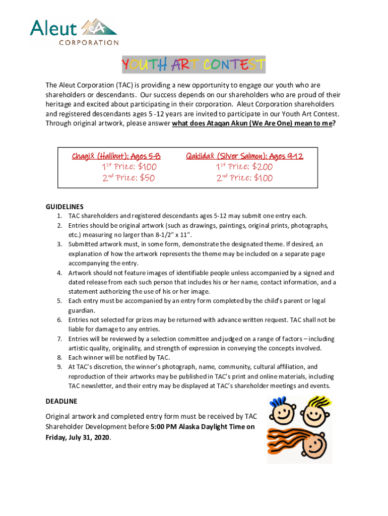YOUTH ART CONTEST The Aleut Corporation (TAC) is providing a new opportunity to engage our youth who are shareholders or descendants. Our success depends on our shareholders who are proud of their