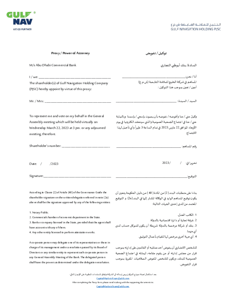 Proxy / Power of Attorney / /M/s Abu Dhabi Commercial Bank I / we: ___ The shareholder(s) of Gulf Navigation Holding Company (PESC) hereby appoint by virtue of this proxy:___: /). (: / Mr. / Mrs.: