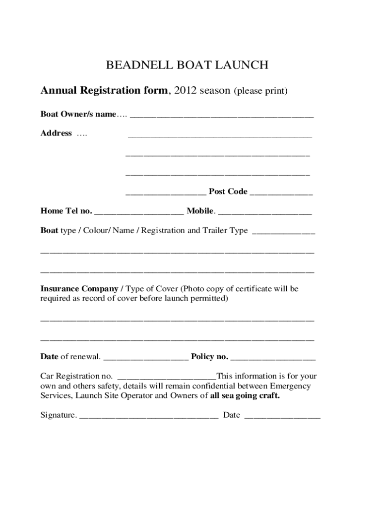 BEADROLL BOAT LAUNCH Annual Registration form, 2012 season (please print) Boat Owner/s name. ___ Address.___ ___ ___ ___ Post Code ___Home Tel no. ___ Mobile. ___ Boat type / Color/ Name / Registration