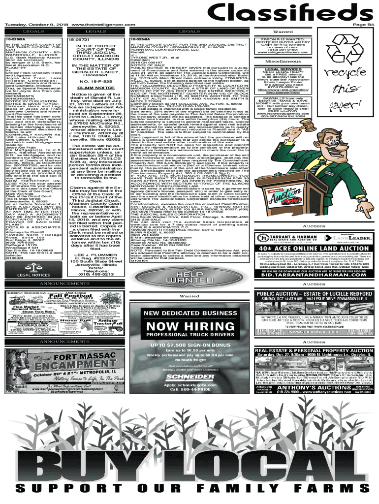 Classifieds Tuesday, October 9, 2018 www.theintelligencer.com LEGALS Page B5LEGALS 180672I180296IA IN THE CIRCUIT COURT OF THE THIRD JUDICIAL CIRCUIT MADISON COUNTY EDWARDSVILLE, ILLINOIS U.S. Bank