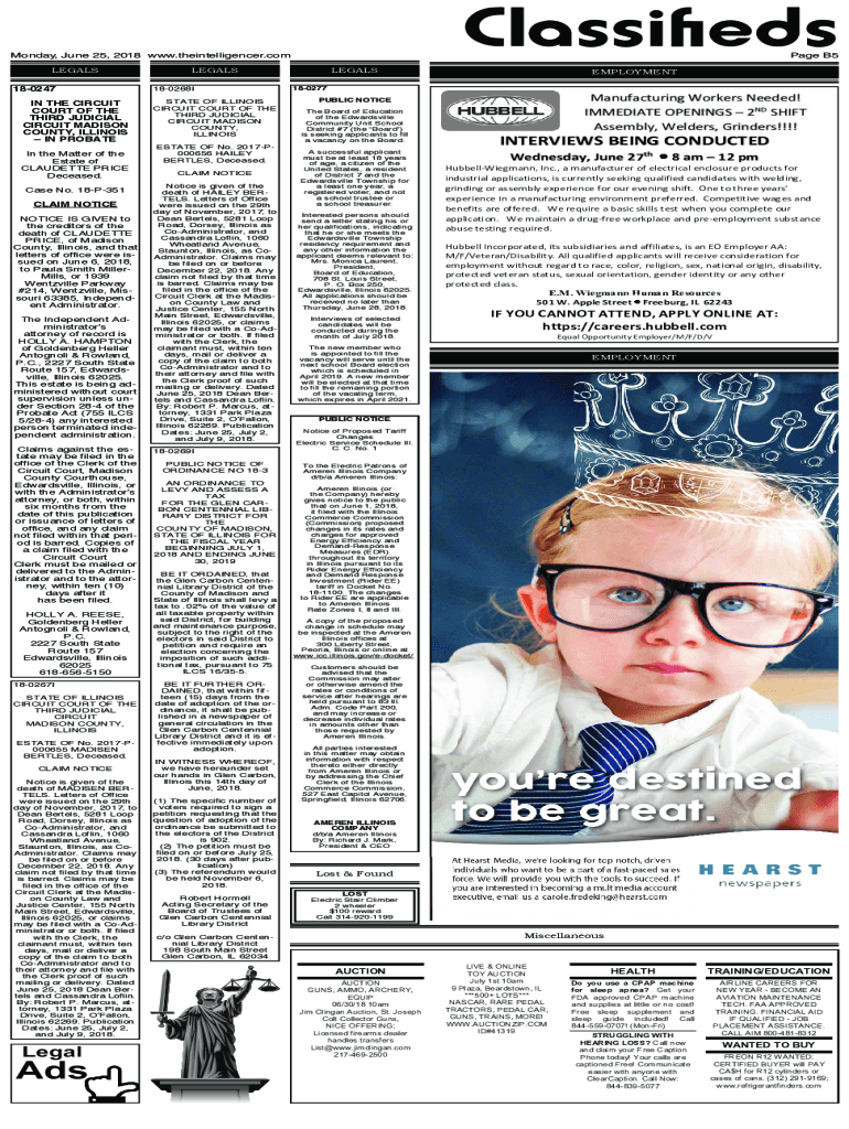 Classifieds Monday, June 25, 2018 www.theintelligencer.com LEGALS 180247 IN THE CIRCUIT COURT OF THE THIRD JUDICIAL CIRCUIT MADISON COUNTY, ILLINOIS IN PROBATE In the Matter of the Estate of CLAUDETTE
