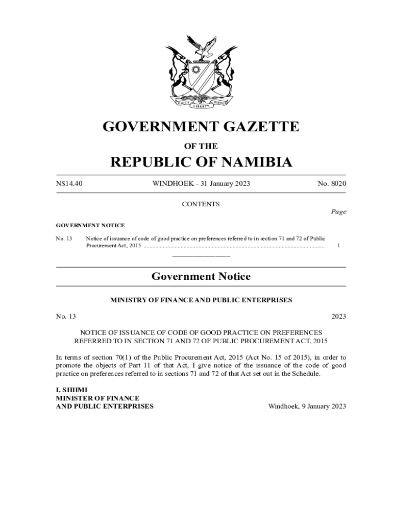 GOVERNMENT GAZETTE OF REPUBLIC OF NAMIBIA N$14.40WINDHOEK 31 January 2023No. 8020CONTENTSPageGOVERNMENT NOTICE of issuance of code of good practice on preferences referred to in section 71 and 72