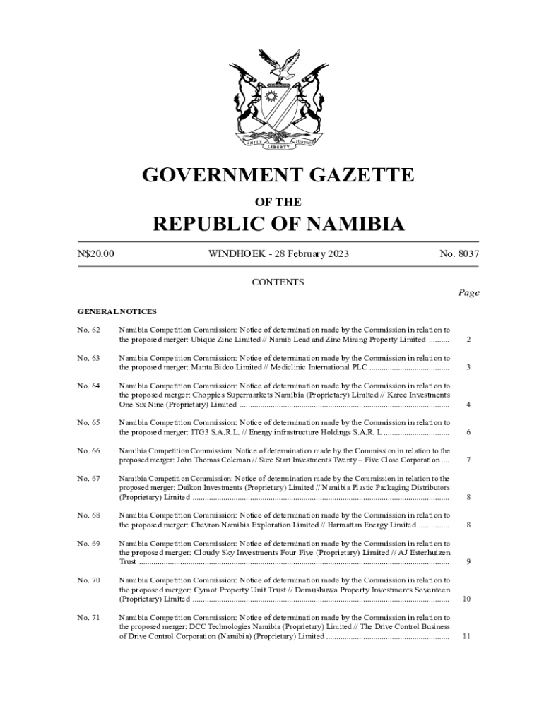 GOVERNMENT GAZETTE OF REPUBLIC OF NAMIBIA N$20.00WINDHOEK 28 February 2023CONTENTSNo. 8037PageGENERAL NOTICES No. 62Namibia Competition Commission: Notice of determination made by the Commission in