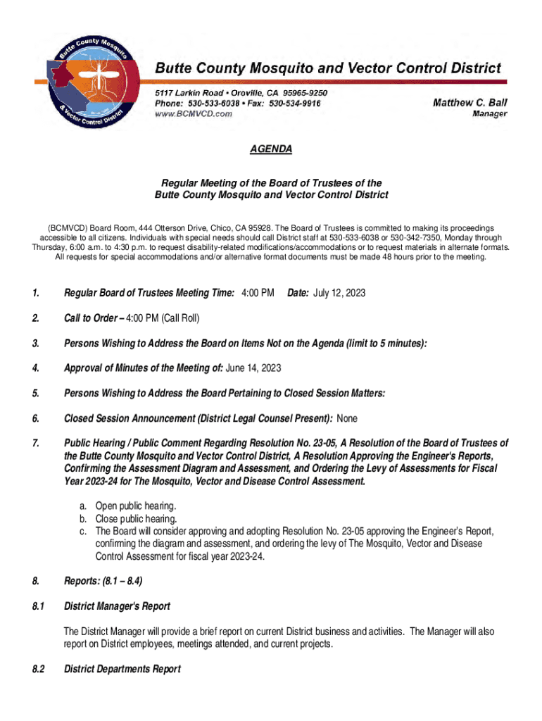 AGENDARegular Meeting of the Board of Trustees of the Butte County Mosquito and Vector Control District (BOMBED) Board Room, 444 Otter son Drive, Chico, CA 95928. The Board of Trustees is committed
