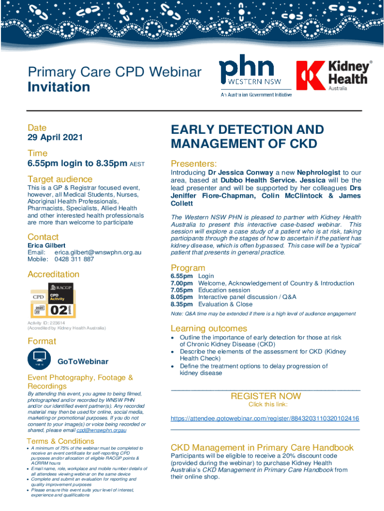 Primary Care CPD Webinar Invitation Date 29 April 2021 Time 6.55pm login to 8.35pm AEST Target audience This is a GP & Registrar focused event, however, all Medical Students, Nurses, Aboriginal Health