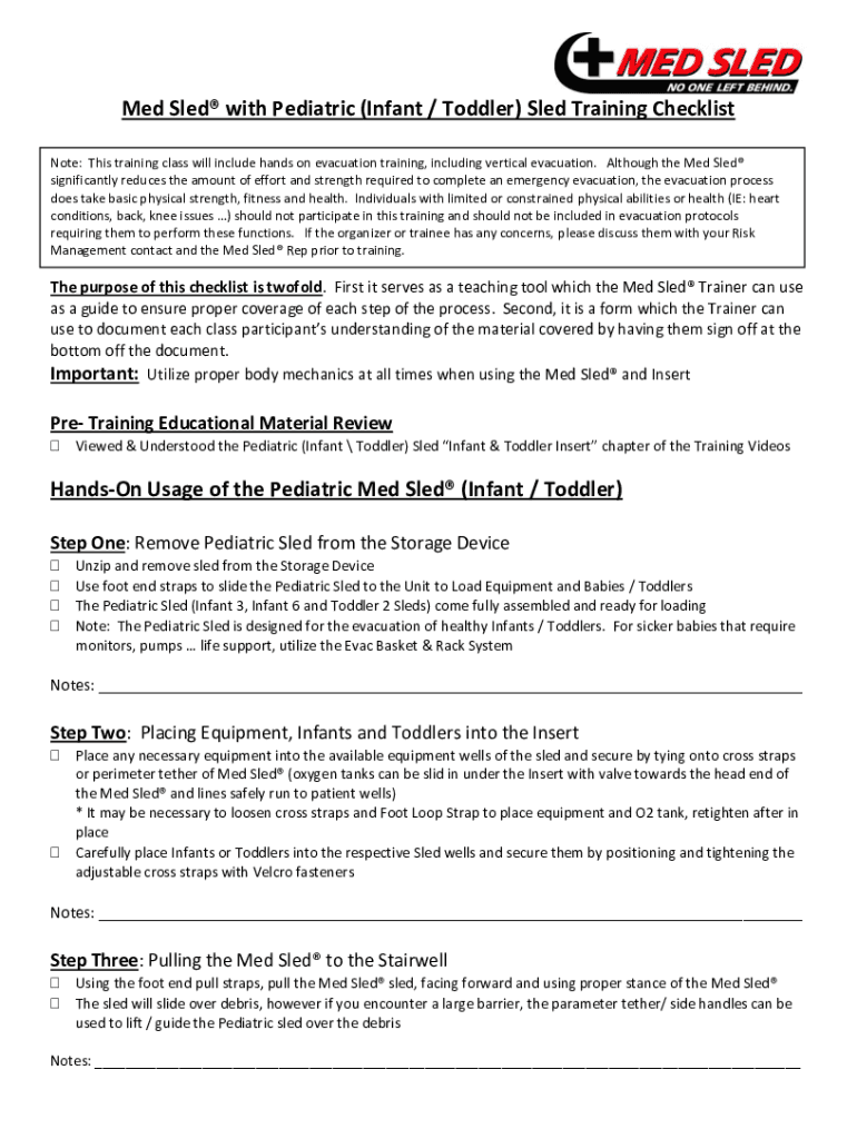 Med Sled with Pediatric (Infant / Toddler) Sled Training Checklist Note: This training class will include hands-on evacuation training, including vertical evacuation. Although the Med Sled significantly