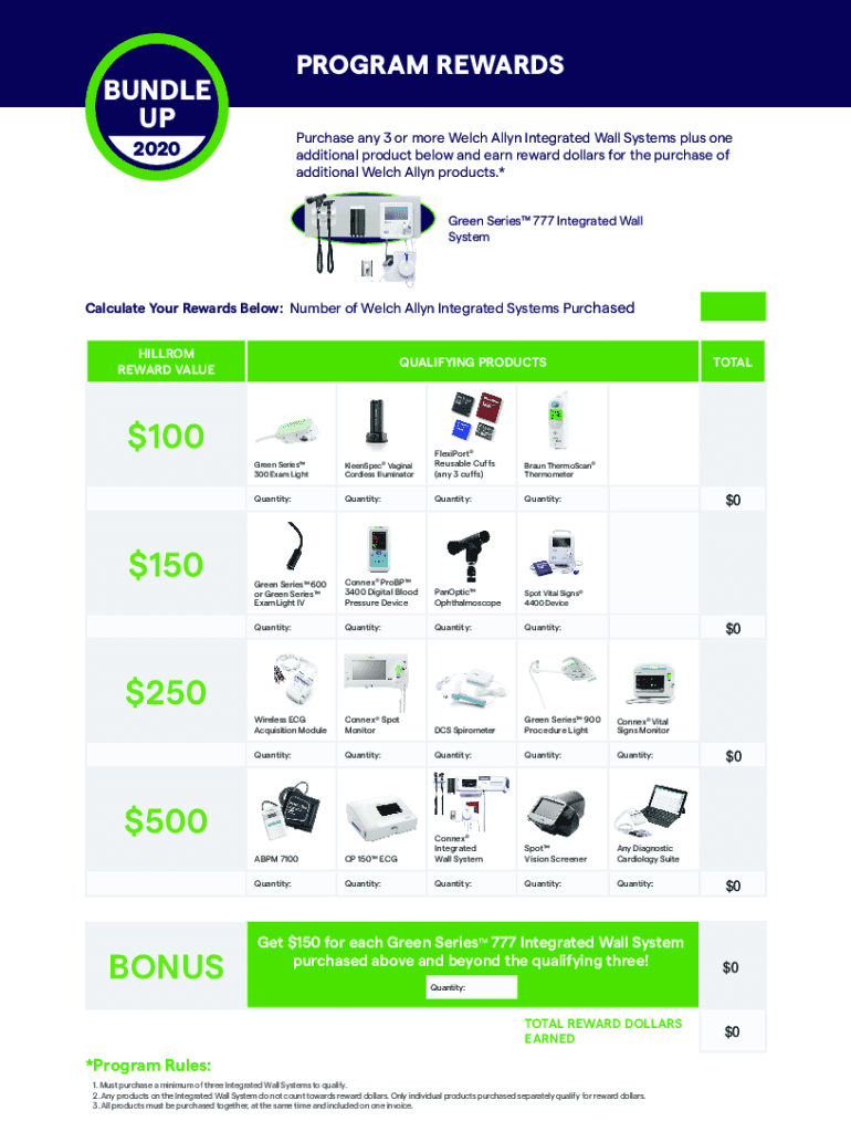 BUNDLE UP 2020 Outfitting your facility has never been this rewarding Hillrom.com/BundleUp2020PROGRAM REWARDSBUNDLE Purchase any 3 or more Welch Allyn Integrated Wall Systems plus one additional product