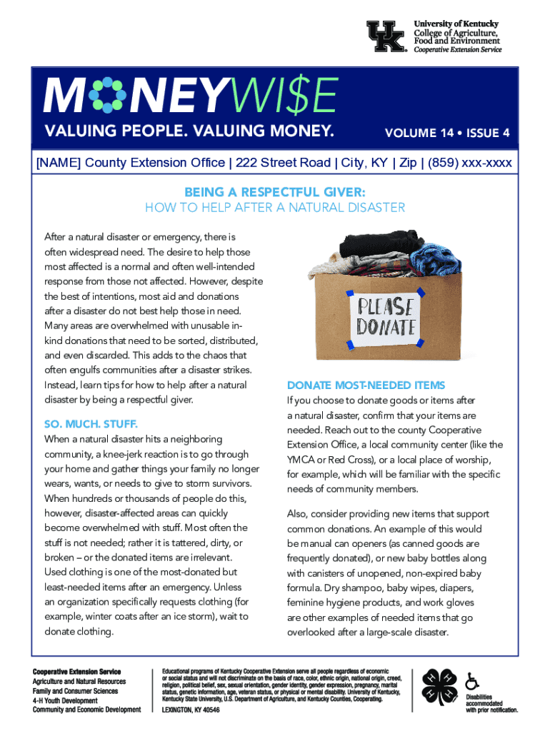 M NELLIE VALUING PEOPLE. VALUING MONEY.VOLUME 14 ISSUE 4[NAME] County Extension Office | 222 Street Road | City, KY | Zip | (859) xxxix BEING A RESPECTFUL GIVER: HOW TO HELP AFTER A NATURAL DISASTER