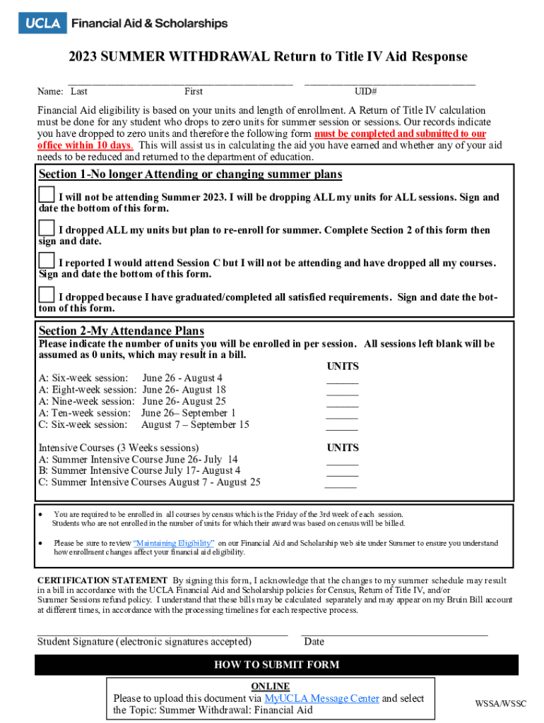 2023 SUMMER WITHDRAWAL Return to Title IV Aid Response ___ Name: Last First___ UID#Financial Aid eligibility is based on your units and length of enrollment. A Return of Title IV calculation must