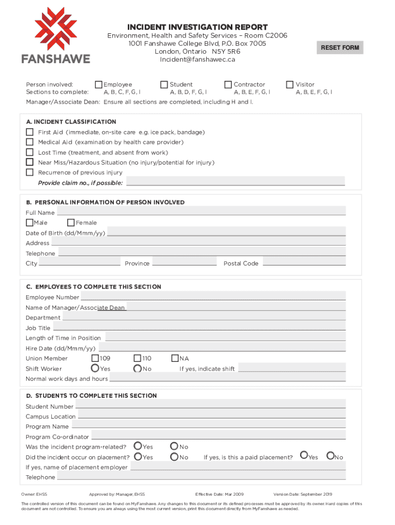 GUIDE TO COMPLETING THE INCIDENT INVESTIGATION REPORT FORM Definitions Incident: an unplanned event that results in, or could result in, an injury or fatality, or damage/destruction of equipment,