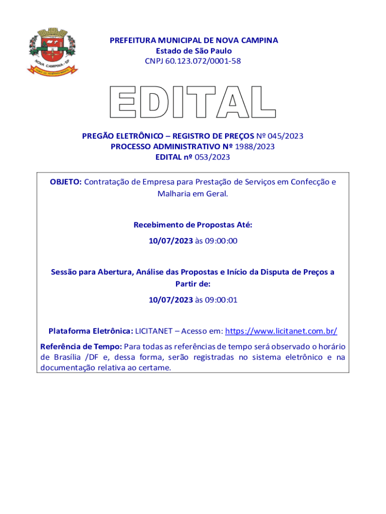 PREFECTURE MUNICIPAL DE NOVA CAMPING Est ado de So Paulo CNJ 60.123.072/000158PREGO ELECTRIC REGISTRY DE PRESS N 045/2023 PROCESS ADMINISTRATIVE N 1988/2023 EDIT AL n 053/2023 OBJECT: Contralto de