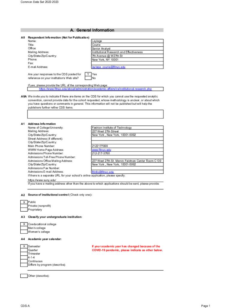 Common Data Set 20222023A. General Information A0Respondent Information (Not for Publication) Name: Title: Office: Mailing Address: City/State/Zip/Country: Phone: Fax: Email Address: Are your responses