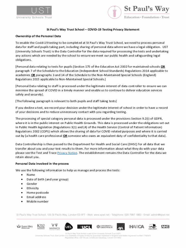 St Paul's Way Trust School COVID-19 Testing Privacy Statement Ownership of the Personal Data To enable the COVID-19 testing to be completed at St Paul's Way Trust School, we need to process personal