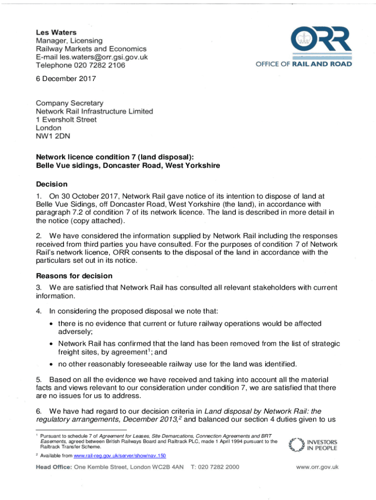 6 December 2017Network license condition 7 (land disposal): Belle Vue.JS sidings, Don caster Road, West Yorkshire Decision 1. On 30 October 2017, Network Rail gave notice of its intention to dispose