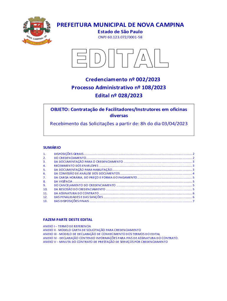 PREFECTURE MUNICIPAL DE NOVA CAMPING Est ado de So Paulo CNJ 60.123.072/000158Credenciamento n 002/2023 Process Administrative n 108/2023 Edital n 028/2023 OBJECT: Contralto de Facilitadores/Instructors
