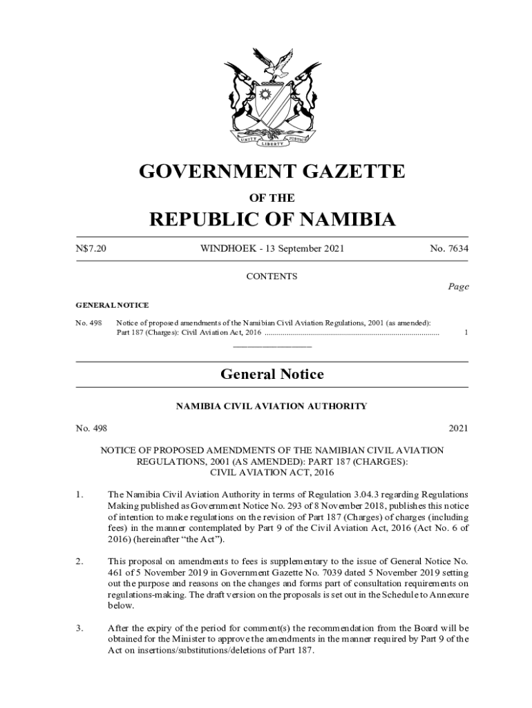 GOVERNMENT GAZETTE OF REPUBLIC OF NAMIBIA N$7.20WINDHOEK 13 September 2021No. 7634CONTENTSPageGENERAL NOTICE No. 498Notice of proposed amendments of the Namibian Civil Aviation Regulations, 2001 (as