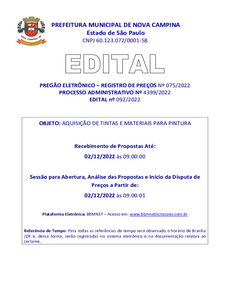 PREFECTURE MUNICIPAL DE NOVA CAMPING Est ado de So Paulo CNJ 60.123.072/000158PREGO ELECTRIC REGISTRY DE PRESS N 075/2022 PROCESS ADMINISTRATIVE N 4399/2022 EDIT AL n 092/2022OBJETO: AQUINO DE TINTS