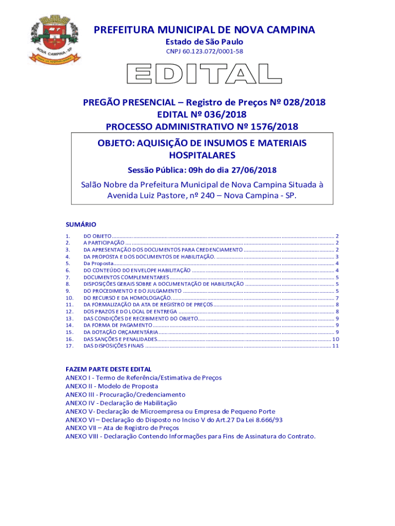 PREFECTURE MUNICIPAL DE NOVA CAMPING Est ado de So Paulo CNJ 60.123.072/000158PREGO PRESENCE Registry de Preos N 028/2018 EDIT AL N 036/2018 PROCESS ADMINISTRATIVE N 1576/2018 OBJECT: AQUINO DE INSU