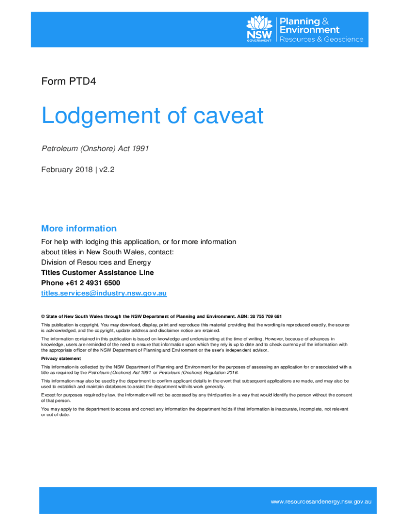 Form PTD4Lodgement of caveat Petroleum (Onshore) Act 1991 February 2018 | v2.2More information For help with lodging this application, or for more information about titles in New South Wales, contact: