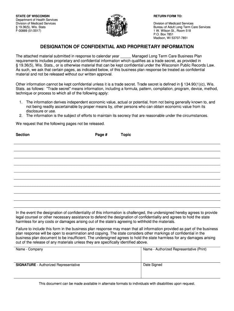 STATE OF WISCONSIN Department of Health Services Division of Medicaid Services 19.36(5), Wis. Stats F00889 (01/2017)RETURN FORM TO: Division of Medicaid Services Bureau of Adult Long Term Care Services