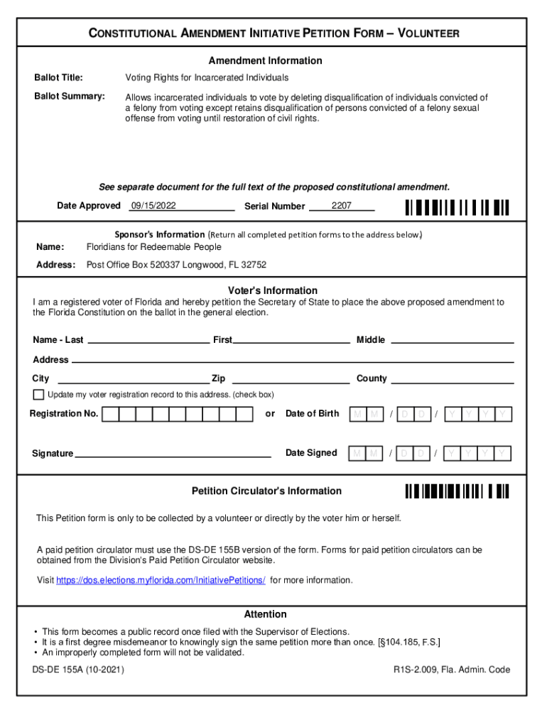 CONSTITUTIONAL AMENDMENT INITIATIVE PETITION FORM VOLUNTEER Amendment Information Ballot Title:Voting Rights for Incarcerated IndividualsBallot Summary:Allows incarcerated individuals to vote by deleting