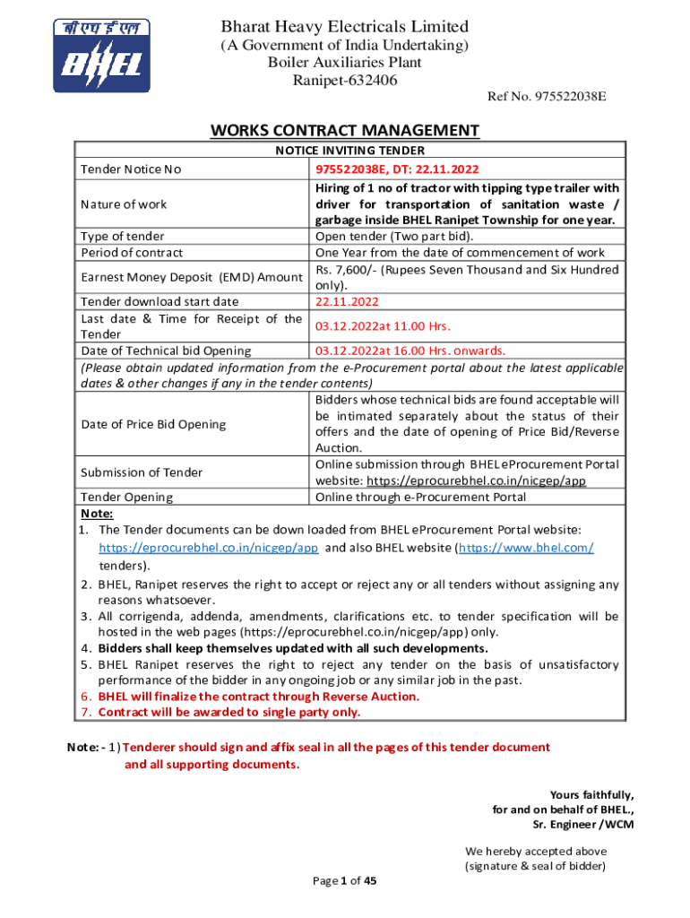 Bharat Heavy Electrical Limited (A Government of India Undertaking) Boiler Auxiliaries Plant Ranipet632406 Ref No. 975522038EWORKS CONTRACT MANAGEMENT NOTICE INVITING TENDER Notice No 975522038E,