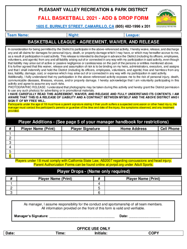 PLEASANT VALLEY RECREATION & PARK DISTRICTFALL BASKETBALL 2021 ADD & DROP FORM