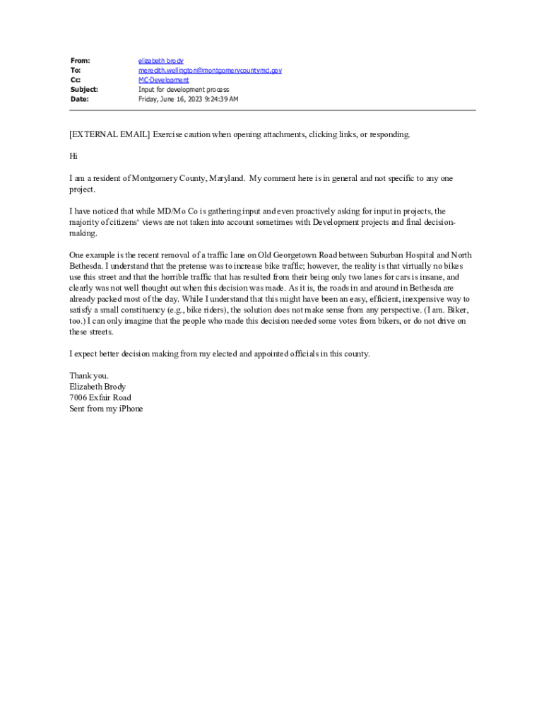 From: To: Cc: Subject: Date:Elizabeth Brody meredith.wellington@montgomerycountymd.gov Development Input for development process Friday, June 16, 2023 9:24:39 AM[EXTERNAL EMAIL] Exercise caution when