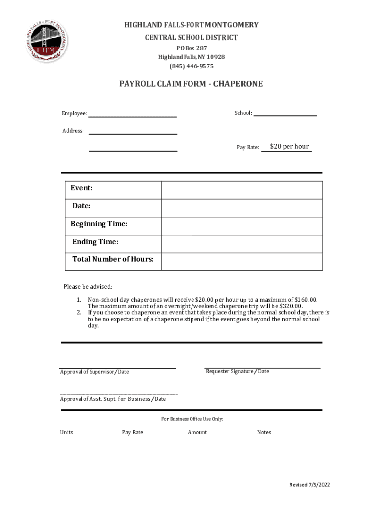 HIGHLAND FALLOUT MONTGOMERY CENTRAL SCHOOL DISTRICT PO Box 287 Highland Falls, NY 10928 (845) 4469575PAYROLL CLAIM FORM CHAPERONE School:Employee: Address:Pay Rate:$20 per prevent: Date: Beginning
