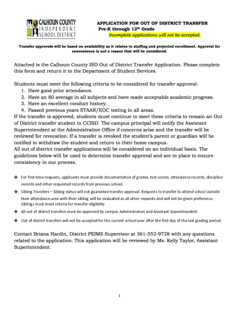 APPLICATION FOR OUT OF DISTRICT TRANSFER Prey through 12th Grade Incomplete applications will not be accepted. Transfer approvals will be based on availability as it relates to staffing and projected