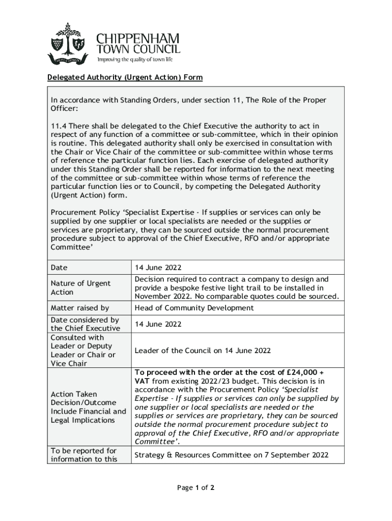 Delegated Authority (Urgent Action) Form In accordance with Standing Orders, under section 11, The Role of the Proper Officer: 11.4 There shall be delegated to the Chief Executive the authority to