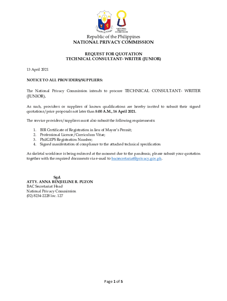 Republic of the Philippines NATIONAL PRIVACY COMMISSION REQUEST FOR QUOTATION TECHNICAL CONSULTANT WRITER (JUNIOR) 13 April 2021 NOTICE TO ALL PROVIDERS/SUPPLIERS: The National Privacy Commission