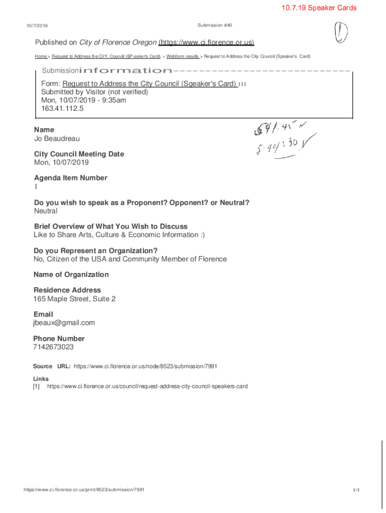 10.7.19 Speaker Cards 10/7/2019Submission #40Published on City of Florence Oregon (HTTPS://www.ci.florence.or.us) Home Request to Address the Ci! Y. Council (P.Baker\'s Card). Web form results Request