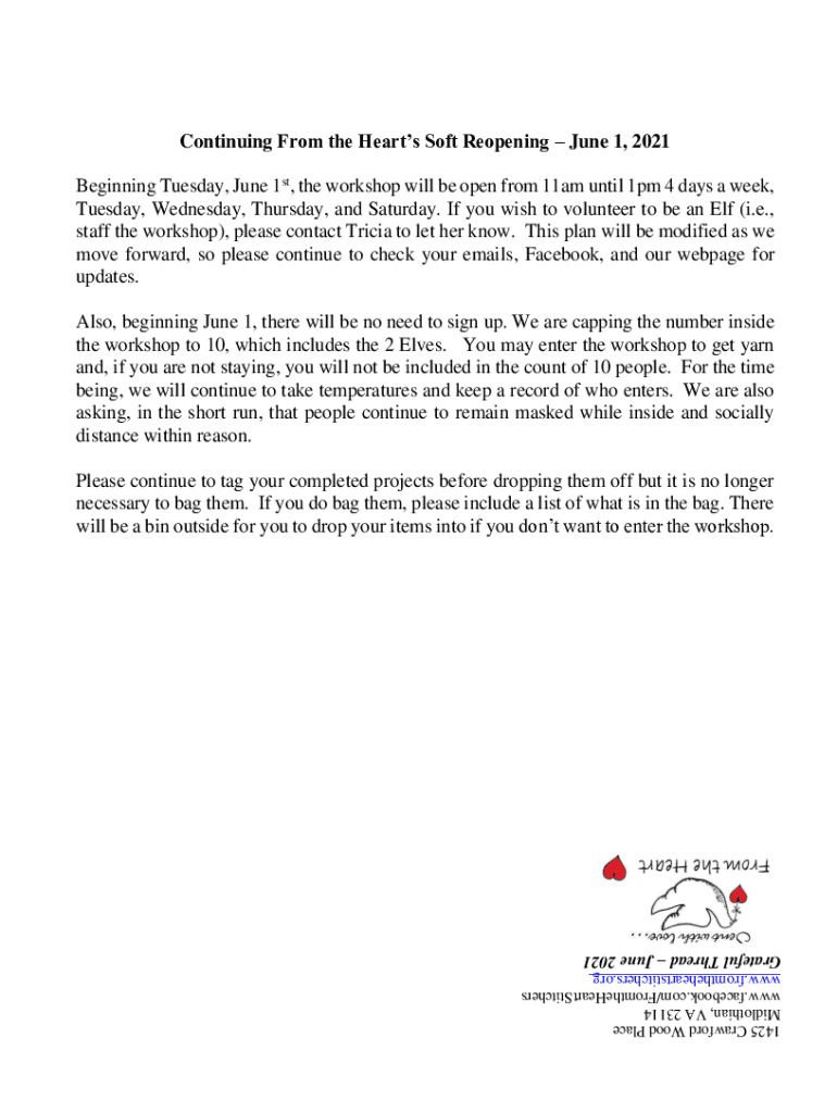 Continuing From the Hearts Soft Reopening June 1, 2021, Beginning Tuesday, June 1st, the workshop will be open from 11am until 1pm 4 days a week, Tuesday, Wednesday, Thursday, and Saturday. If you