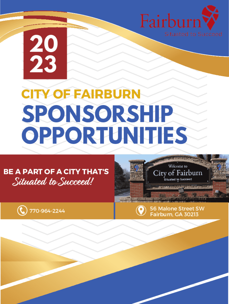20 23 CITY OF FAIRBURNSPONSORSHIP OPPORTUNITIES BE A PART OF A CITY THAT\'Situated to Succeed! 770964224456 Malone Street SW Fair burn, GA 30213JOINTHE CELEBRATION! The City of Fair burn is excited