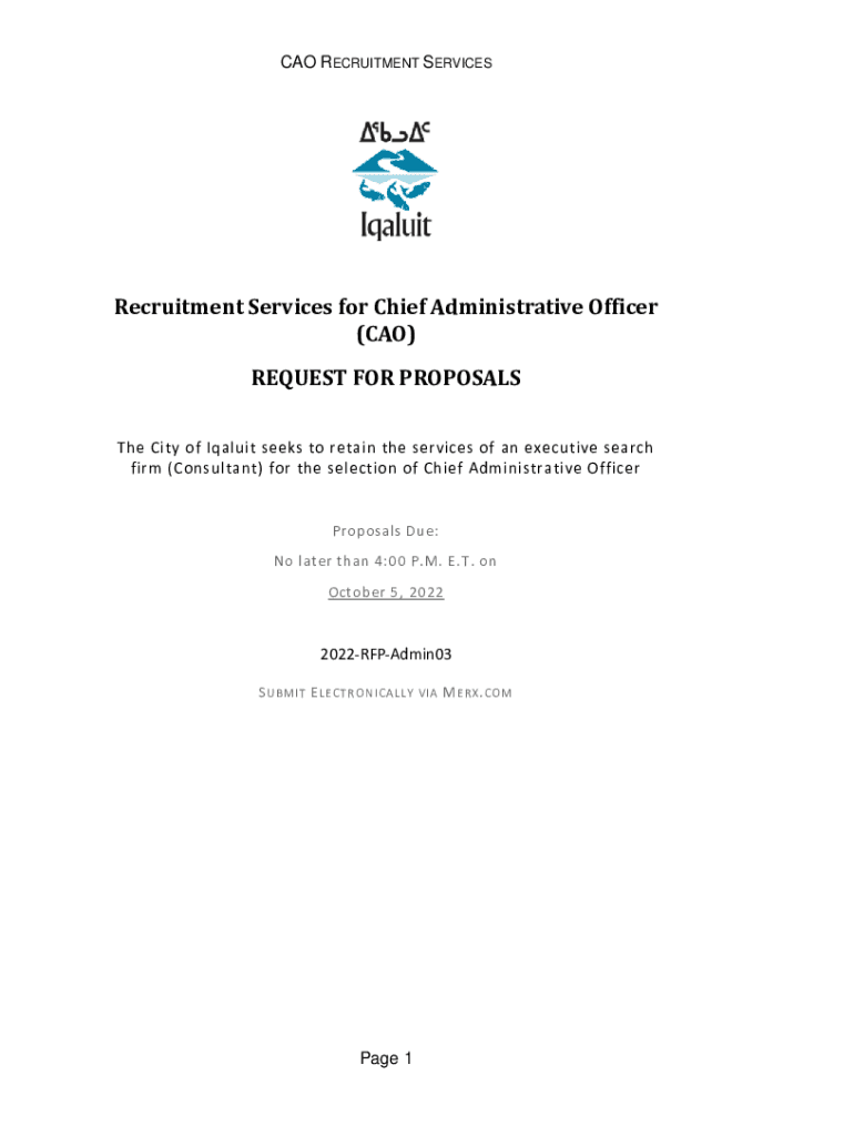 CAN RECRUITMENT SERVICESRecruitment Services for Chief Administrative Officer (CAN) REQUEST FOR PROPOSALS The City of Iqaluit seeks to retain the services of an executive search firm (Consultant)