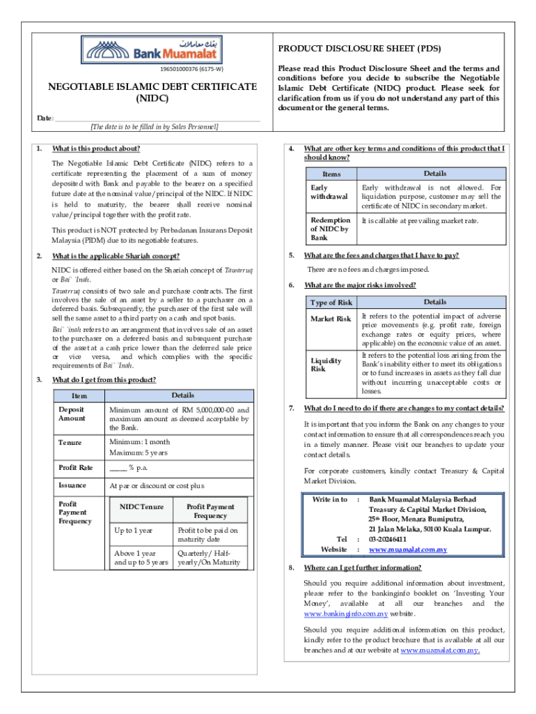 PRODUCT DISCLOSURE SHEET (PDS)NEGOTIABLE ISLAMIC DEBT CERTIFICATE (IDC)Please read this Product Disclosure Sheet and the terms and conditions before you decide to subscribe the Negotiable Islamic
