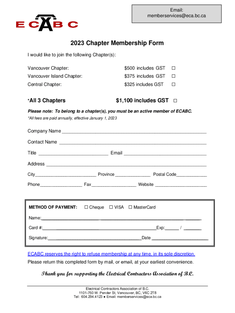 Email: memberservices@eca.bc.ca2023 Chapter Membership Form I would like to join the following Chapter(s): Vancouver Chapter:$500 includes Vancouver Island Chapter:$375 includes Central Chapter:$325