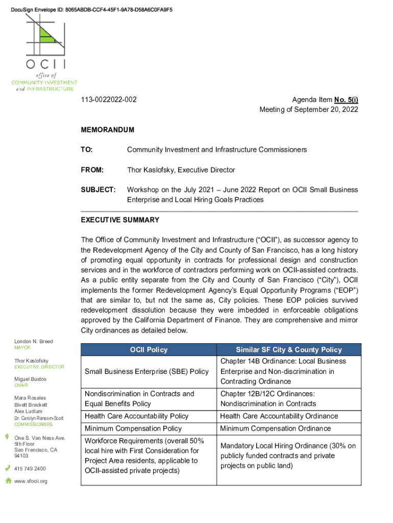 TO:Community Investment and Infrastructure CommissionersFROM:Thor Kaspersky, Executive DirectorSUBJECT:Workshop on the July