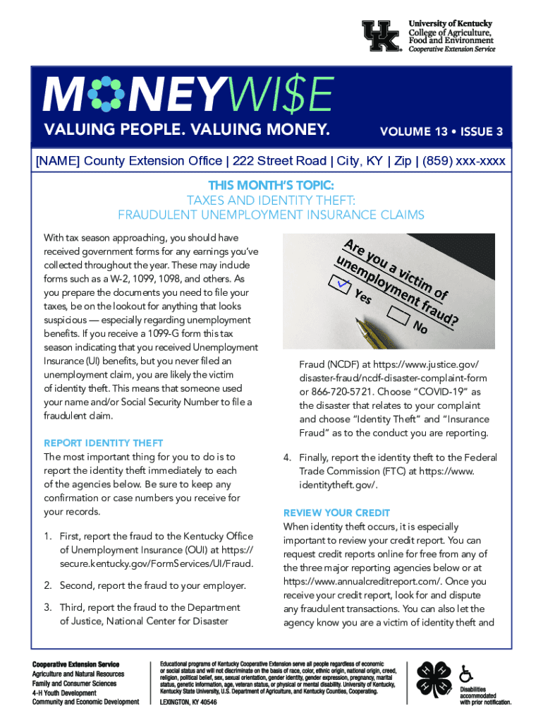 M NELLIE VALUING PEOPLE. VALUING MONEY.VOLUME 13 ISSUE 3[NAME] County Extension Office | 222 Street Road | City, KY | Zip | (859) xxxix THIS MONTHS TOPIC: TAXES AND IDENTITY THEFT: FRAUDULENT UNEMPLOYMENT