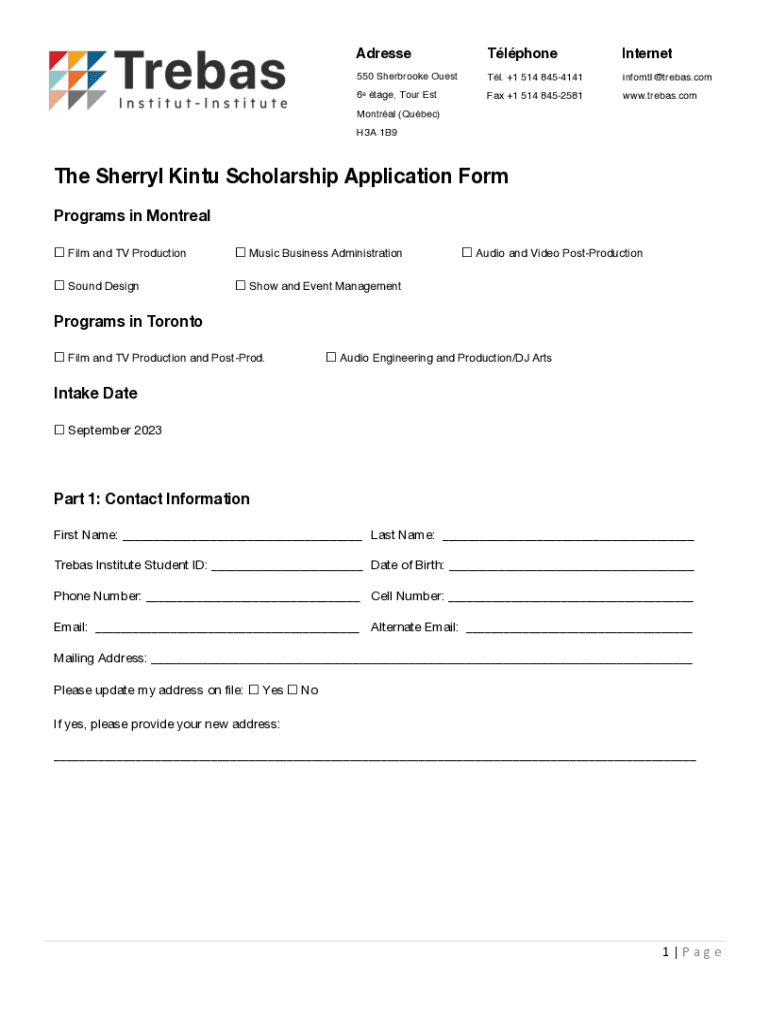 AdresseTlphoneInternet550 Sherbrooke Guest. +1 514 84541416eFax +1 514 8452581ebtage, Tour Estinfomtl@trebas.com www.trebas.comMontral (Quebec) H3A 1B9The Sherry Into Scholarship Application Form