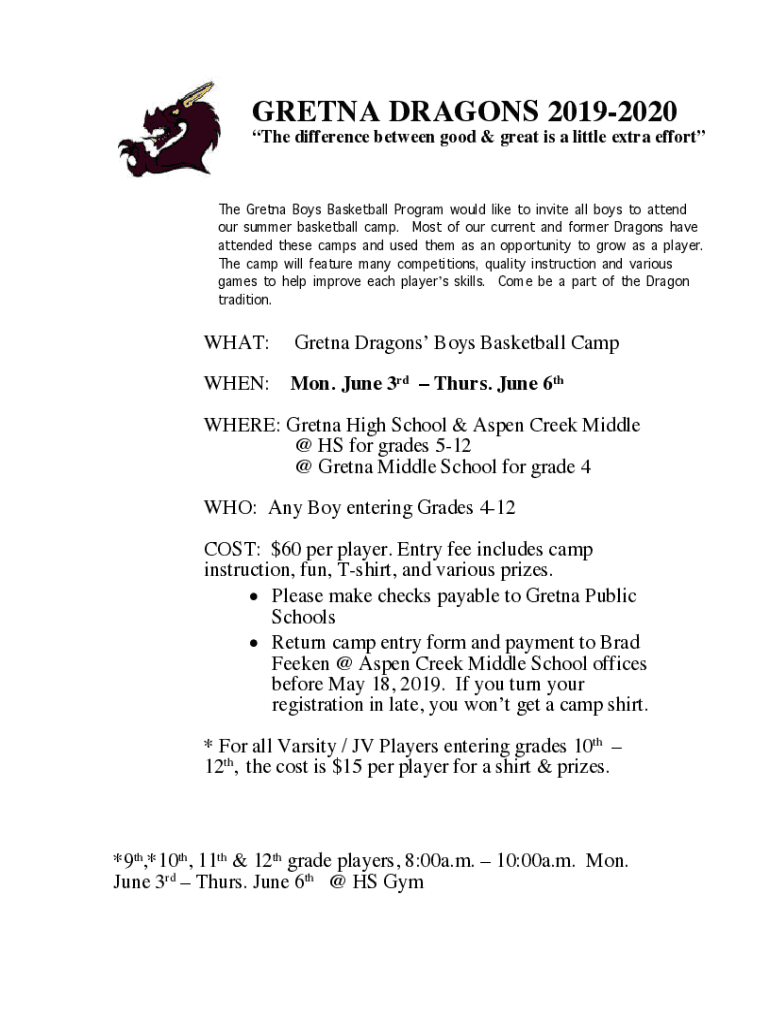 GRETA DRAGONS 20192020 The difference between good & great is a little extra efforts Greta Boys Basketball Program would like to invite all boys to attend our summer basketball camp. Most of our current