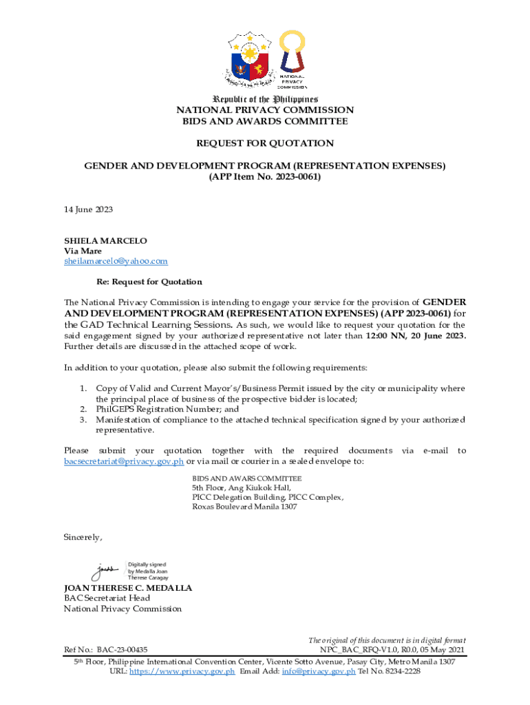 Republic of the Philippines NATIONAL PRIVACY COMMISSION BIDS AND AWARDS COMMITTEE REQUEST FOR QUOTATION GENDER AND DEVELOPMENT PROGRAM (REPRESENTATION EXPENSES) (APP Item No. 20230061) 14 June 2023SHIELA