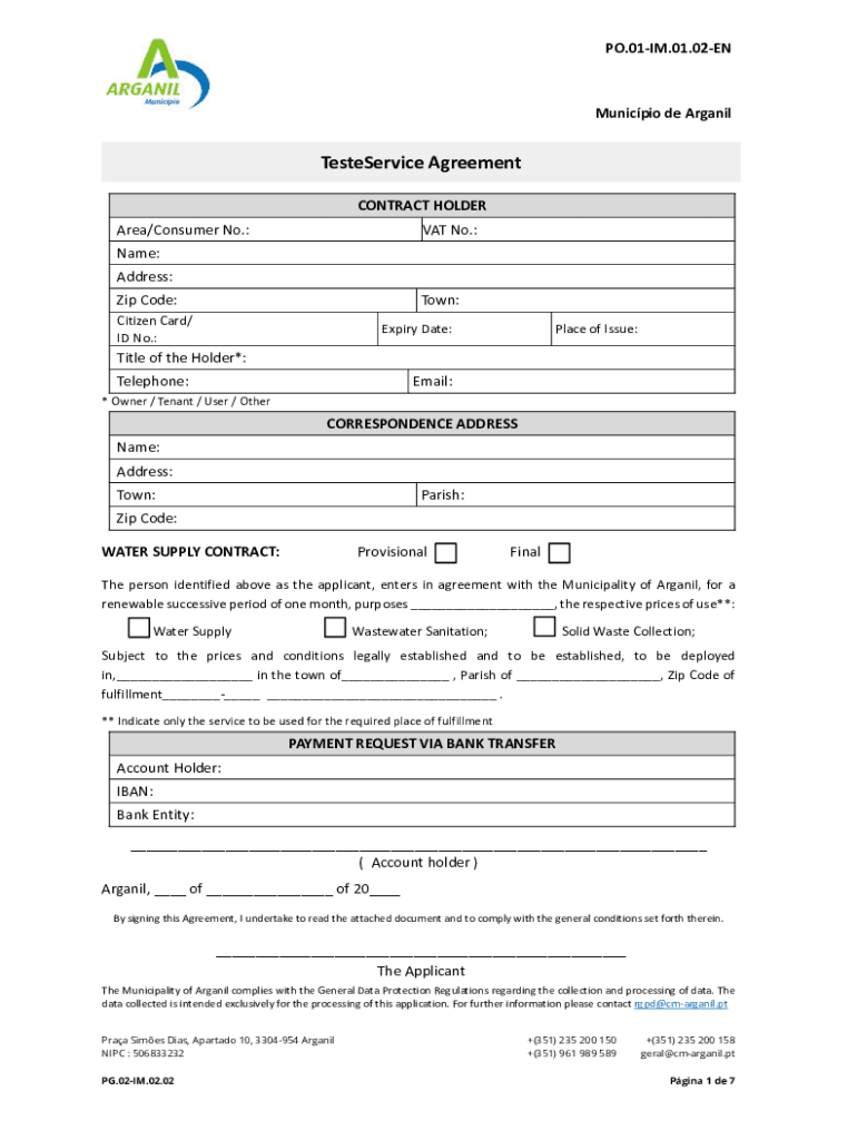 PO.01IM.01.02ENMunicpio de ArganilTesteService Agreement CONTRACT HOLDER Area/Consumer No.:VAT No.:Name: Address: Zip Code:Town:Citizen Card/ ID No.:Expiry Date:Place of Issue:Title of the Holder*: